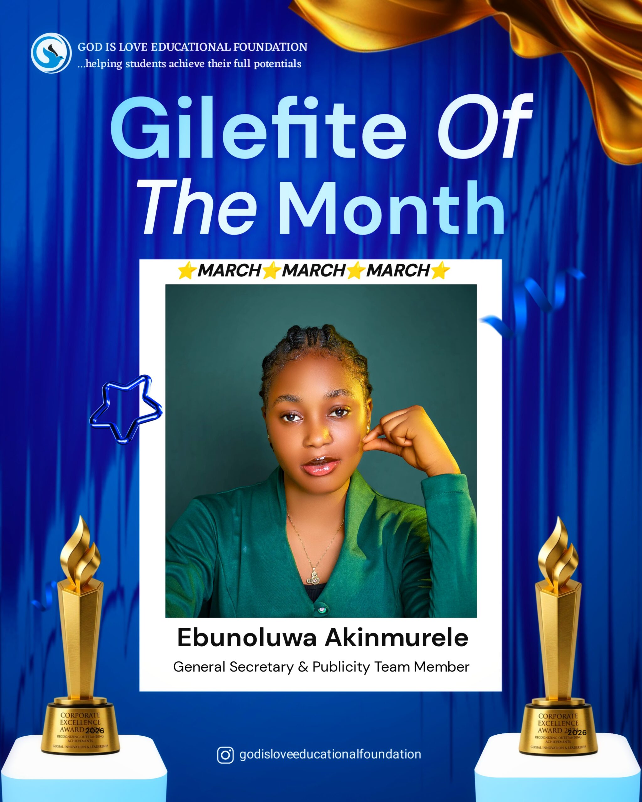 God is Love Educational Foundation (GILEF) has named Miss Ebunoluwa Oluwadarasimi Akinmurele as its Volunteer of the Month for February 2026. Join us in celebrating her dedication, consistency, and contributions to GILEF’s mission of growth and impact on the younger generation.